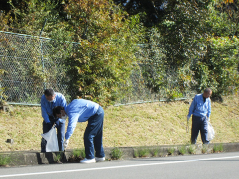 10月の3R推進月間の取り組みとして、工場周辺の歩道清掃を行いました。参加者は7グループに分かれ、車両の往来に注意しながら、歩道に捨てられた吸い殻や飲料容器などを回収し、環境保全に努めることができました。